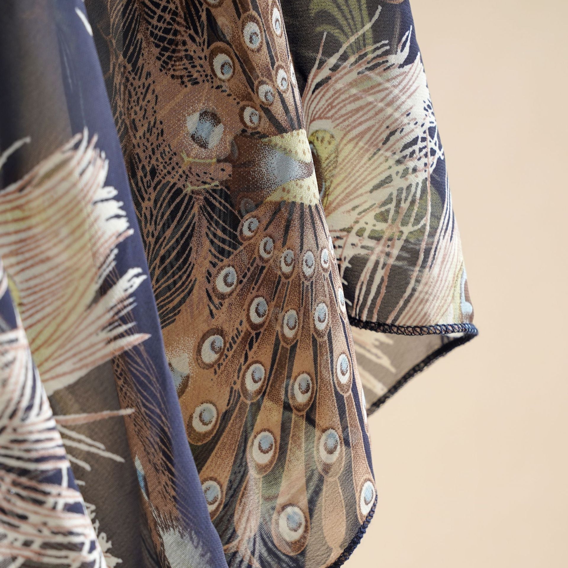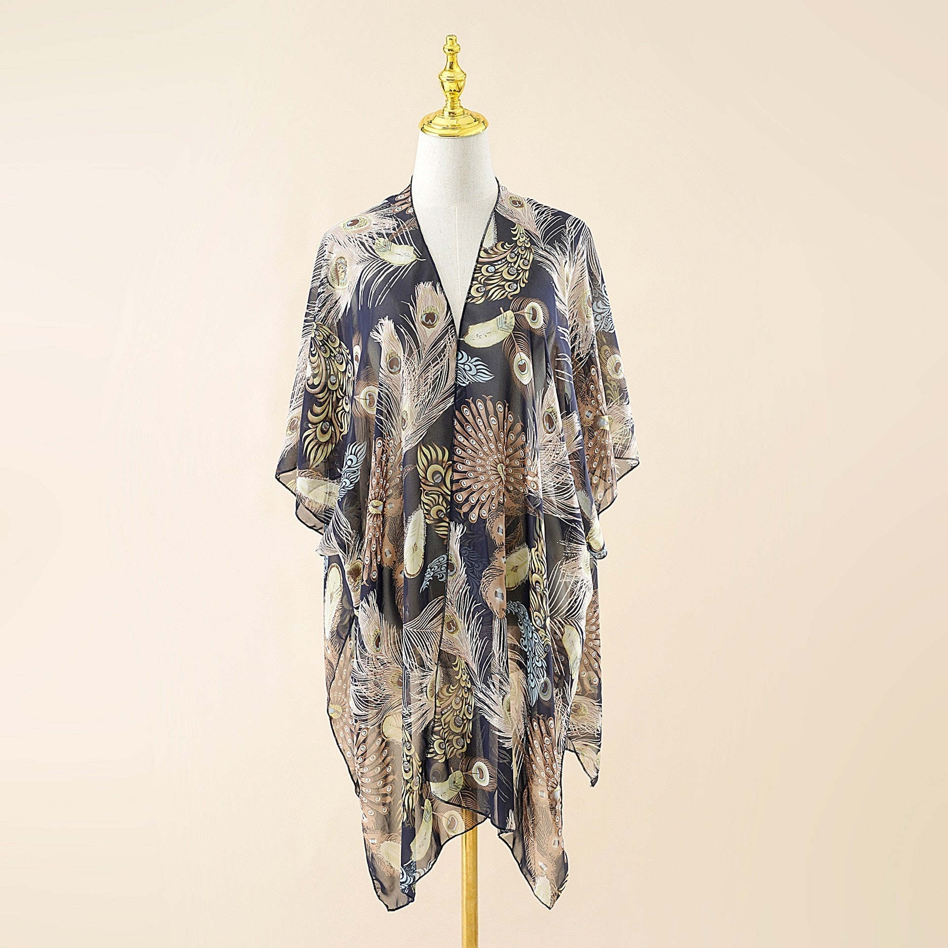 Plášť je vyroben z volné, prodyšné látky, díky čemuž je velmi pohodlný na nošení v horkých dnech. Vzor peří je v současné době velmi módní, díky čemuž je tento plášť praktický i stylový. Charakteristickým rysem tohoto pláště jsou jeho široké rukávy, které umožňují volnost pohybu a dodávají celému outfitu nádech lehkosti. Právě široké rukávy dodávají tomuto střihu lehký a jemný nádech, díky čemuž je ideální na pláž nebo pro nošení v teplých letních dnech.