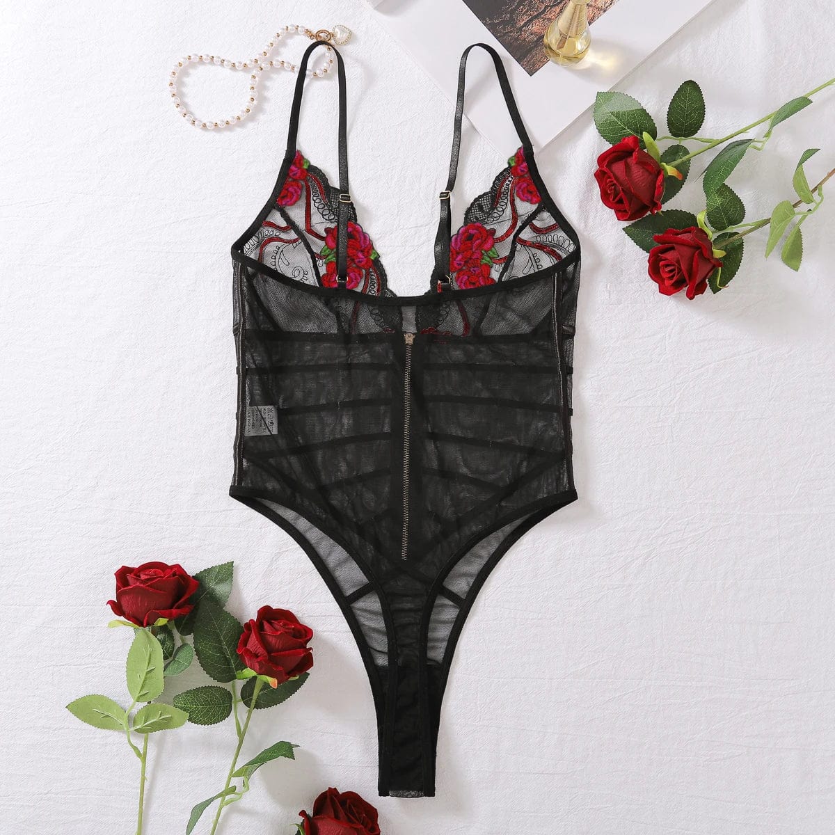 Objevte svou smyslnou stránku s tímto jedinečným body, které kombinuje výrazný design s elegancí. Průsvitná látka a výšivka na poprsí vytvářejí jedinečnou kompozici, která zdůrazní vaše přednosti a posílí vaše sebevědomí.