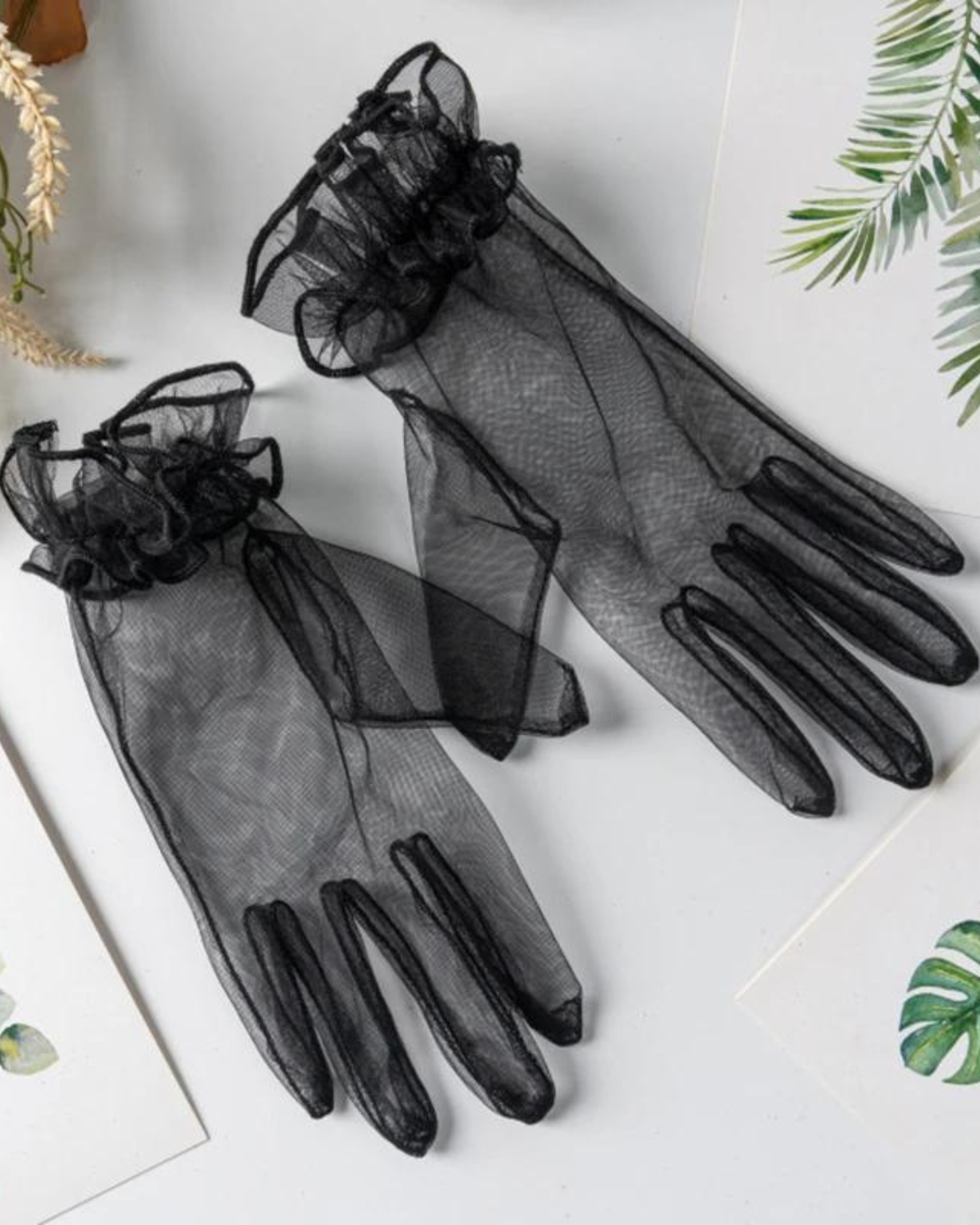Připravte se objevit smyslné kouzlo těchto rukavic, které dodají vašim rukám jedinečný charakter. Jejich jemná, průhledná látka a elegantní volánky na zápěstí vám dodají sebevědomí a ženskost v každé situaci.