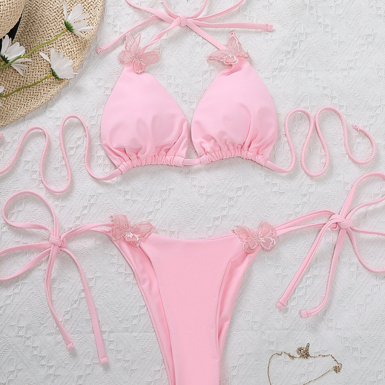 Tyto atraktivní a poutavé plavky s motýlím střihem jistě upoutají pozornost na pláži i u bazénu. Horní díl má měkké trojúhelníkové košíčky, které jemně podpírají poprsí a zajišťují pohodlí a praktičnost. Spodní část tvoří kalhotky, které perfektně padnou. Střih plavek je jednoduchý, ale ramínka s motivem motýlů dodávají plavkám charakter a jedinečnost. Ramínka se dají zavázat a nastavit, takže si můžete plavky přizpůsobit svým individuálním potřebám a preferencím. Plavky s motýlím střihem jsou skvělou volbou pro ženy, které si cení originálního designu a pohodlí.