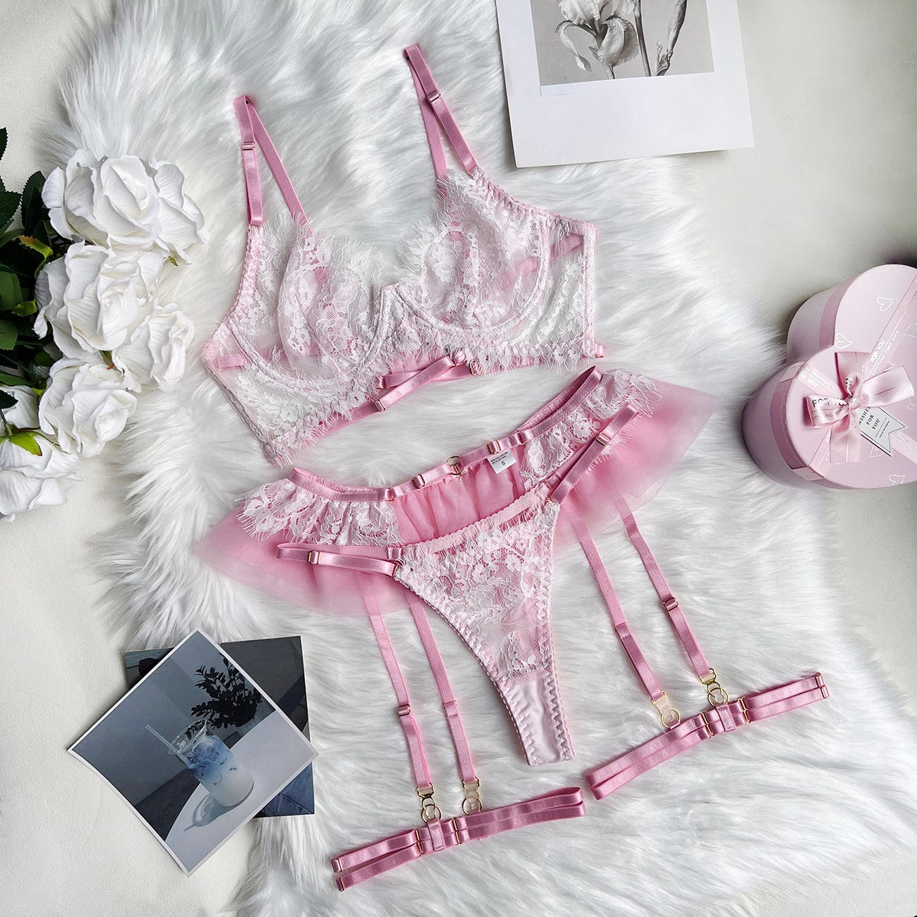 Krajkové akcenty a kostice v podprsence dokonale zvýrazňují poprsí, zatímco nastavitelné prvky zajišťují perfektní střih. Tato sada je ideální volbou pro romantické večery, které chcete udělat nezapomenutelnými.