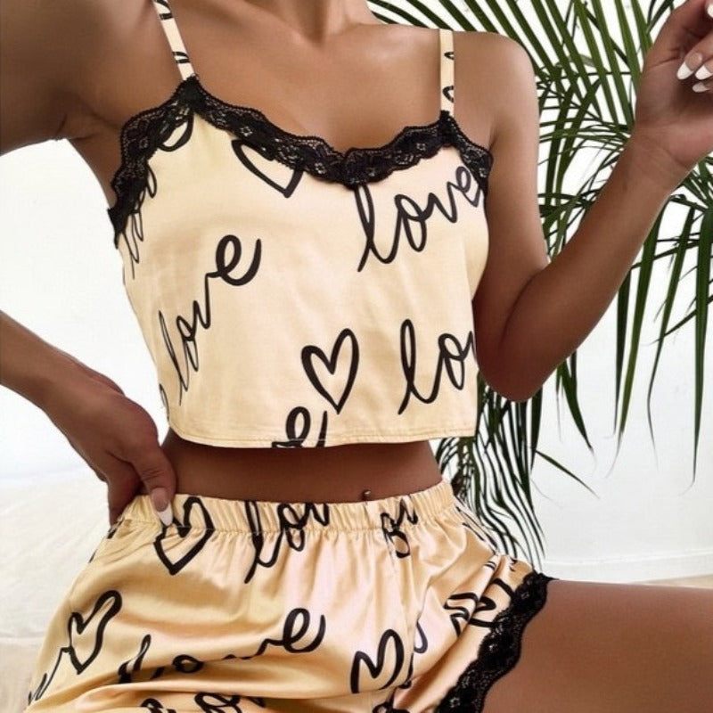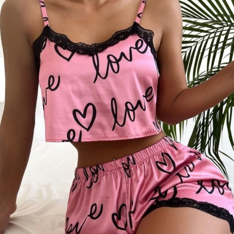Dámské saténové pyžamo s potiskem srdíček a nápisem láska