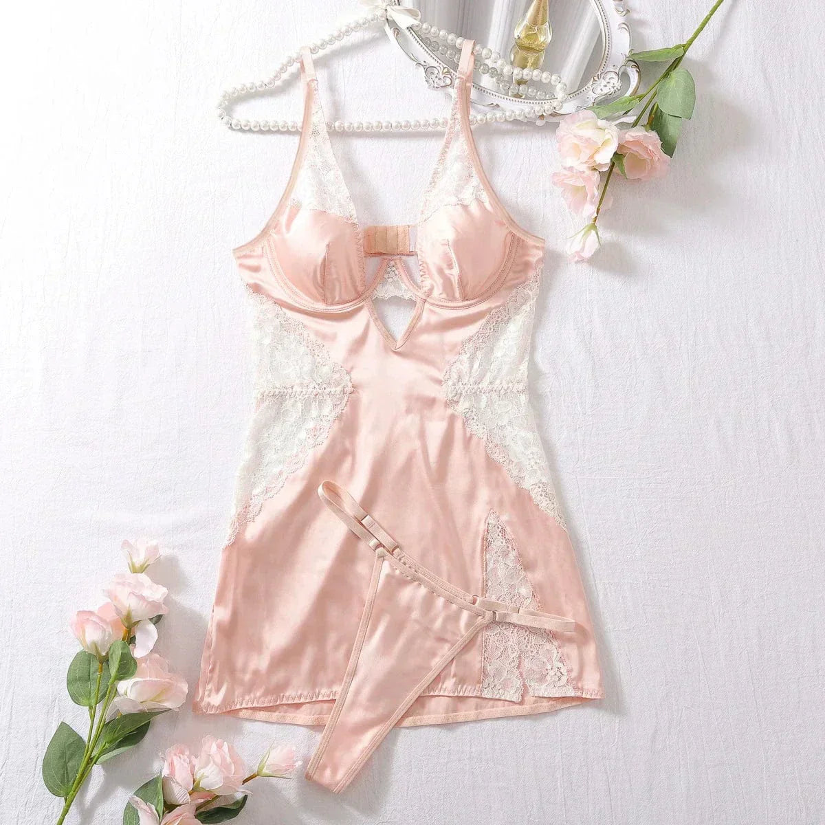 Objevte svou smyslnou stránku s touto elegantní soupravou, která kombinuje výrazný design s pohodlím. Saténové šaty a tanga vytvářejí harmonický celek, který zdůrazní vaše přednosti a dodá vám pocit výjimečnosti.