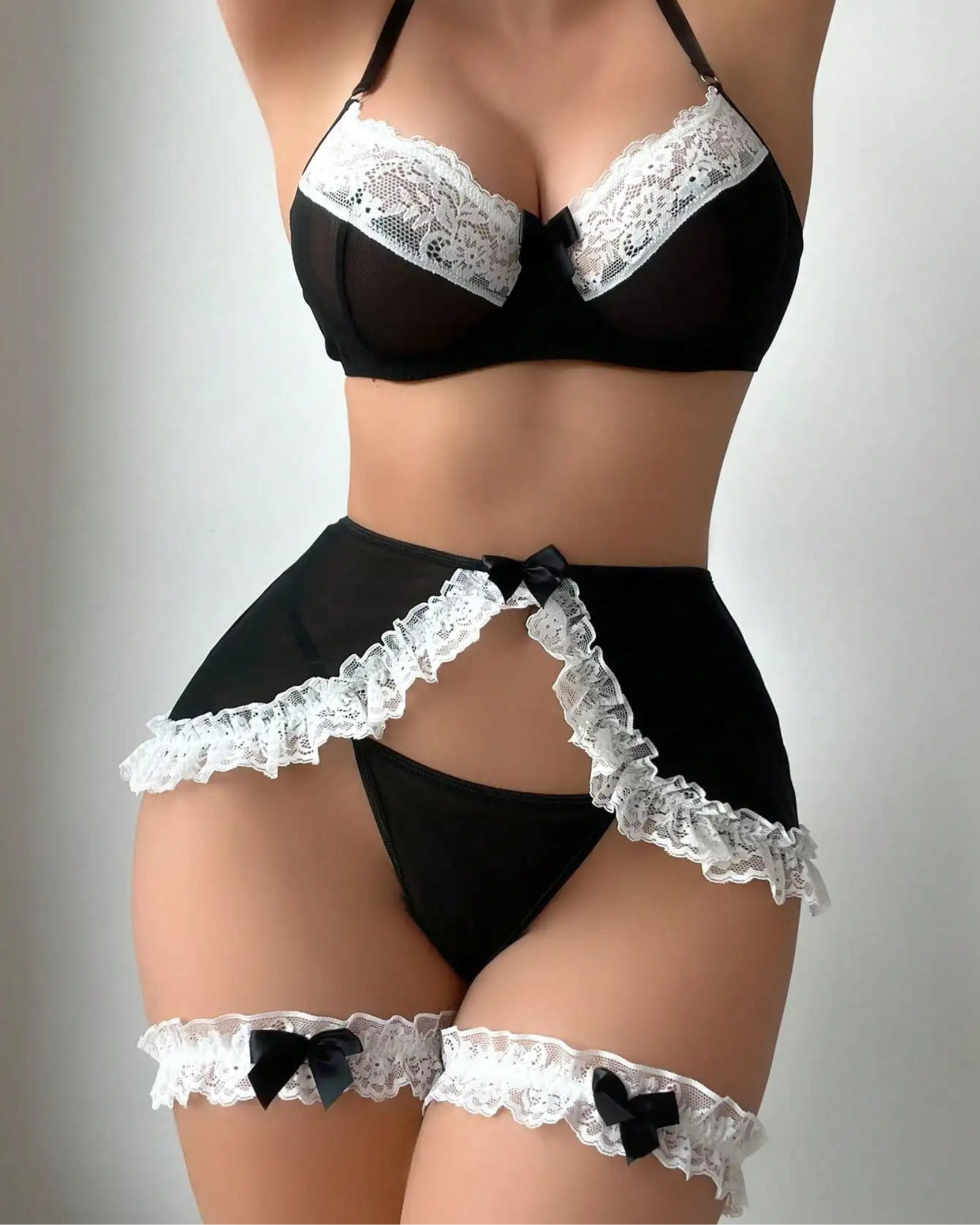 Tento outfit kombinuje výraznou eleganci s hravou smyslností. Černobílý outfit, zdobený krajkou a mašlemi, byl vytvořen tak, aby decentně zdůraznil vaše nejcennější přednosti. Krátká volánová sukně dodává outfitu jedinečný nádech, díky kterému se budete cítit sexy a neuvěřitelně žensky zároveň.
