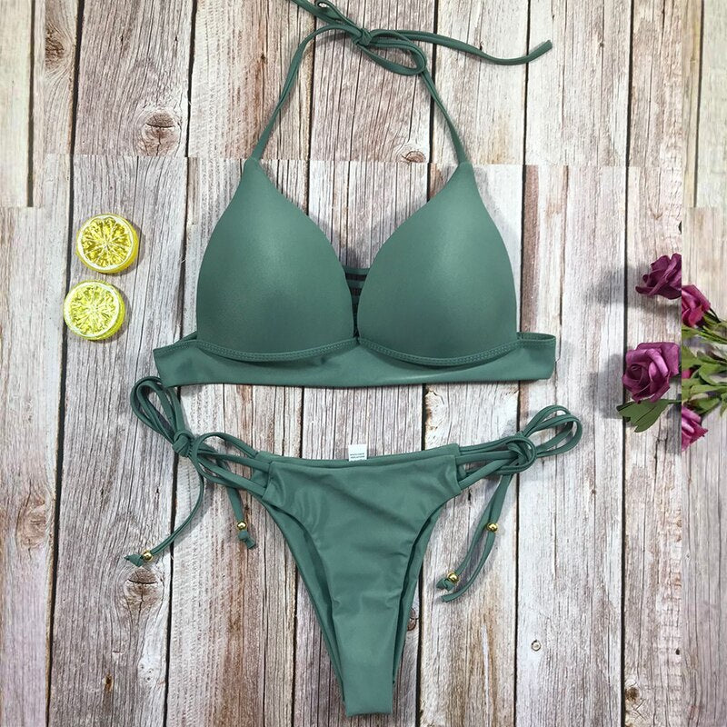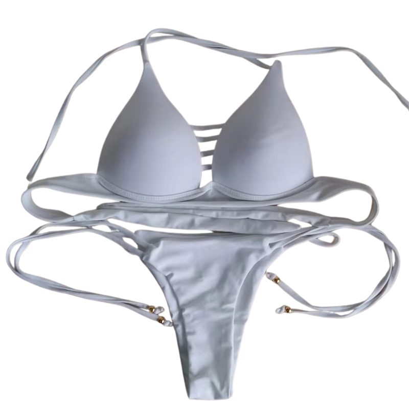 Tyto bikiny jsou navrženy pro letní sezónu a jsou vyrobeny z hladkého materiálu. Podprsenka má trojúhelníkové košíčky, které poskytují oporu a tvarují prsa. Charakteristickým prvkem těchto bikin jsou ramínka, která procházejí mezi košíčky podprsenky. Tato ramínka jsou nejen dekorativní, ale také pomáhají udržet plavky na místě během pohybu. Spodní díl je kalhotkový. Tyto plavky jsou ideální pro ženy, které si cení pohodlí a volnosti pohybu na pláži nebo v bazénu a zároveň chtějí vypadat sexy a stylově.