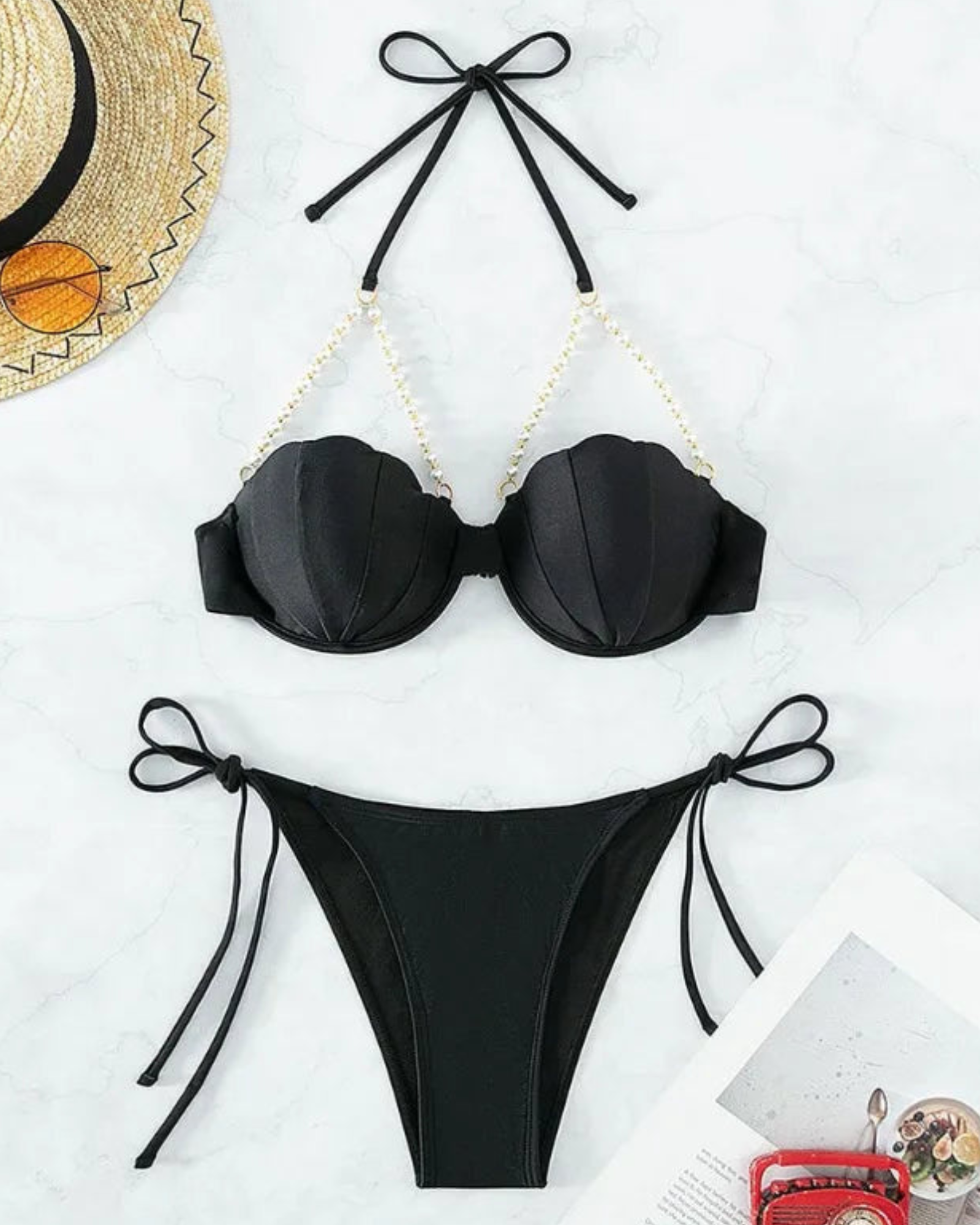Tyto plavky jsou dokonalou kombinací elegance a smyslnosti, díky nimž se každá žena bude cítit výjimečně. Perlové detaily dodávají jemný nádech, zatímco vyztužené košíčky poskytují vynikající oporu a pohodlí. Smyslné zavazování po stranách zdůrazňuje ženské křivky a dodává jim nádech pikantnosti.