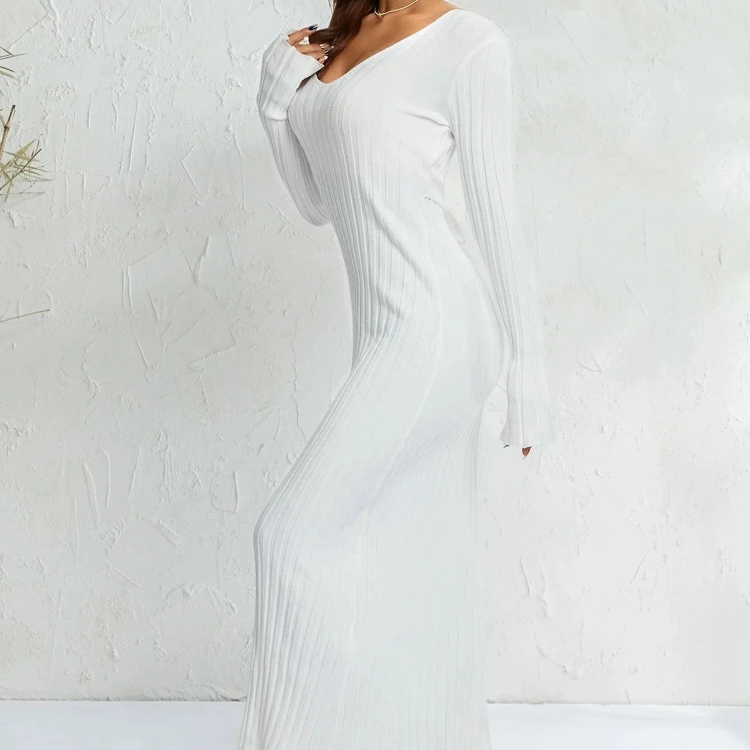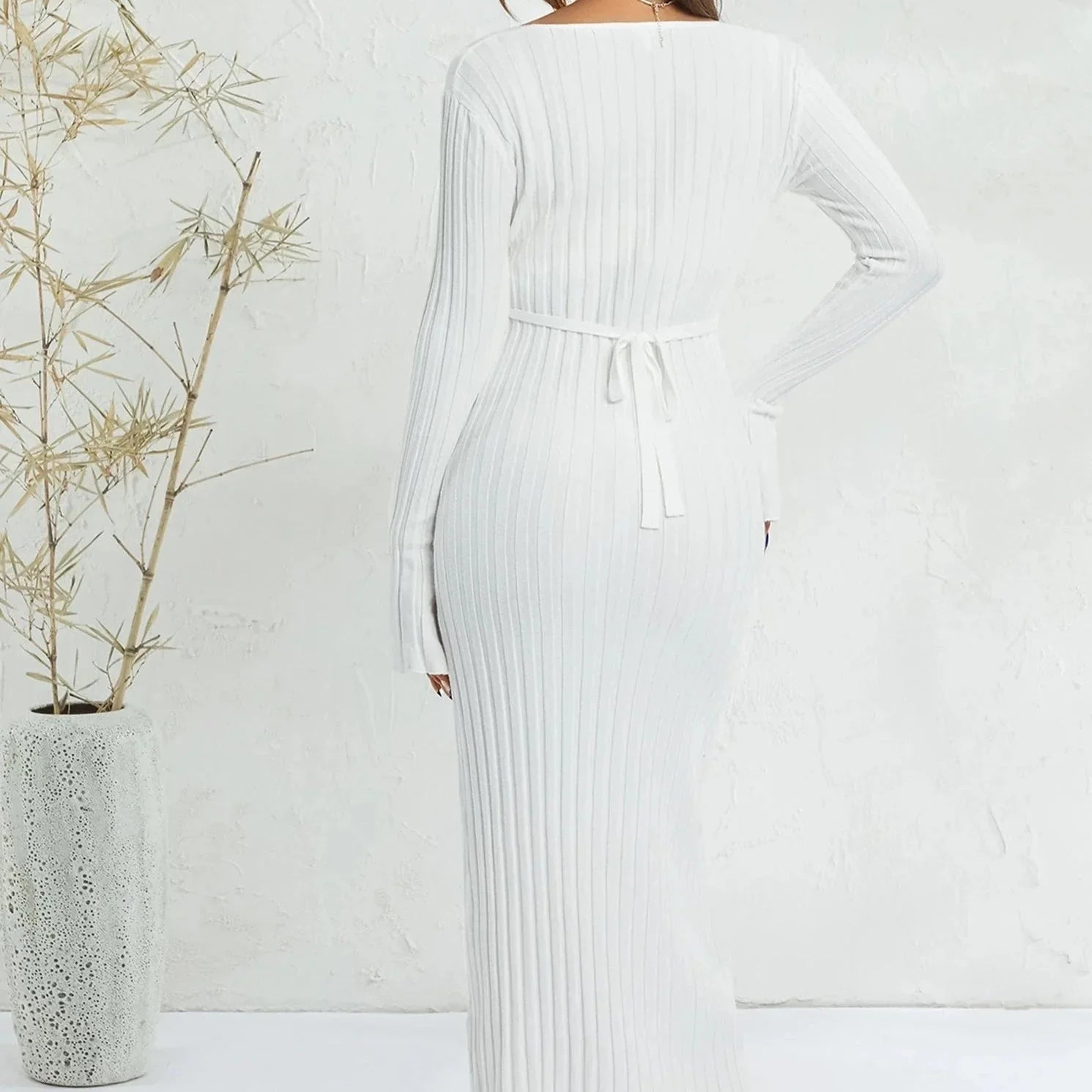 Představujeme přiléhavé pletené maxi šaty, ideální na podzim a zimu. Tyto elegantní šaty s výstřihem do V, dlouhými rukávy, žebrovanou texturou a výrazným zavazováním na zádech, jsou k dispozici v bílé, béžové a černé barvě a promění každý zimní den v stylový.