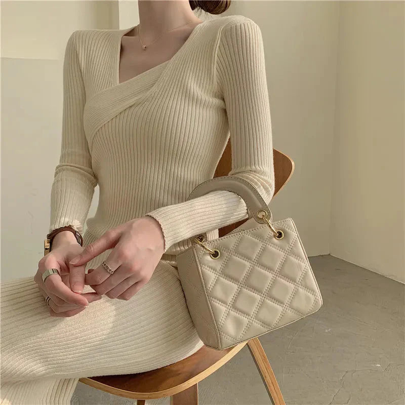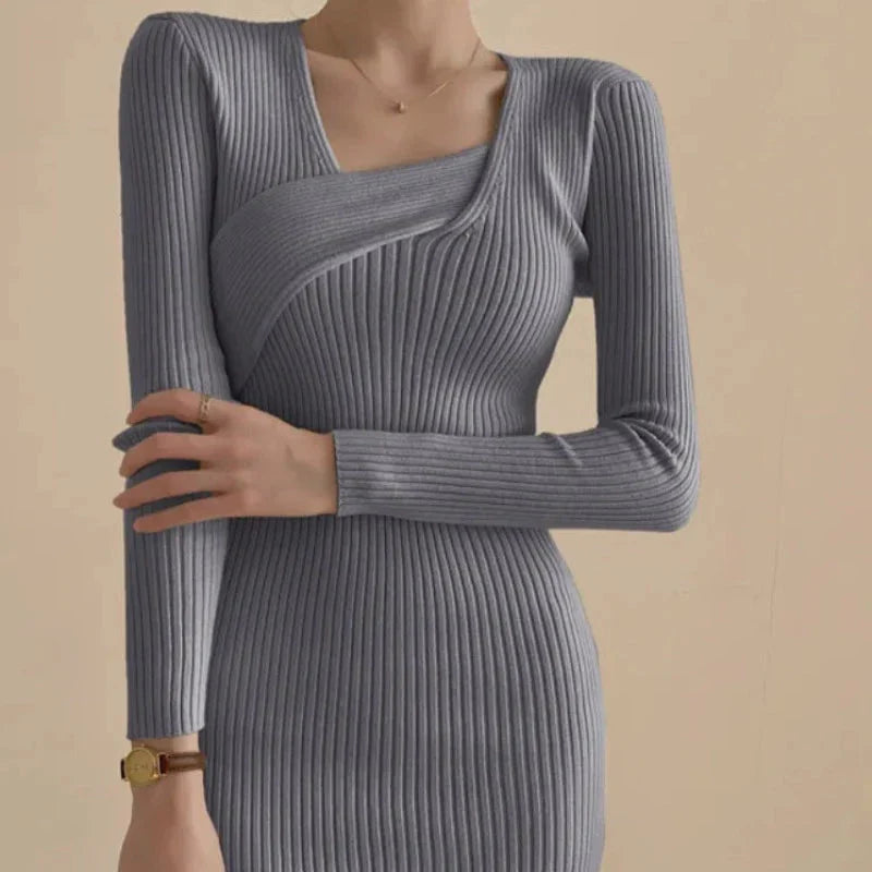 Tyto přiléhavé midi pletené šaty s elegantními proužky jsou k dispozici v tlumených odstínech béžové, šedé, hnědé a černé, ideální pro podzimní a zimní dny. Jejich jedinečná žebrovaná úpletová textura a výstřih do V jim dodávají jedinečný nádech.