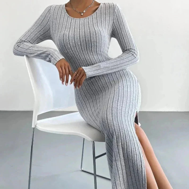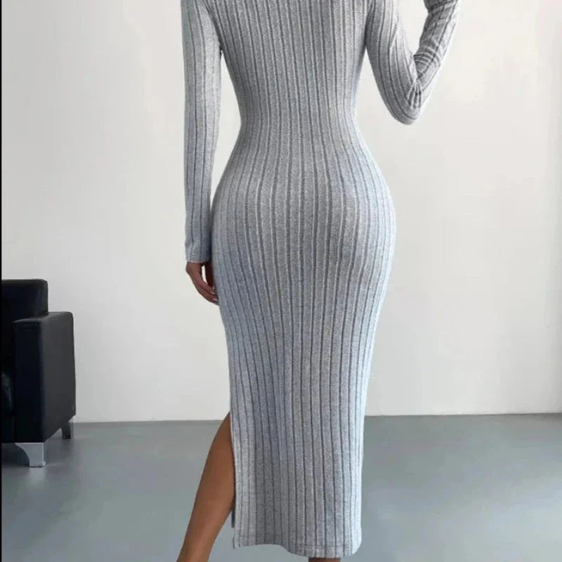 Představujeme elegantní pletené midi šaty, které vás zaujmou svou přiléhavou siluetou, decentní šedou barvou a žebrovanou texturou. Tyto šaty s dlouhým rukávem a kulatým výstřihem, ideální na podzim a zimu, jsou ještě jedinečnější díky stylovému rozparku.