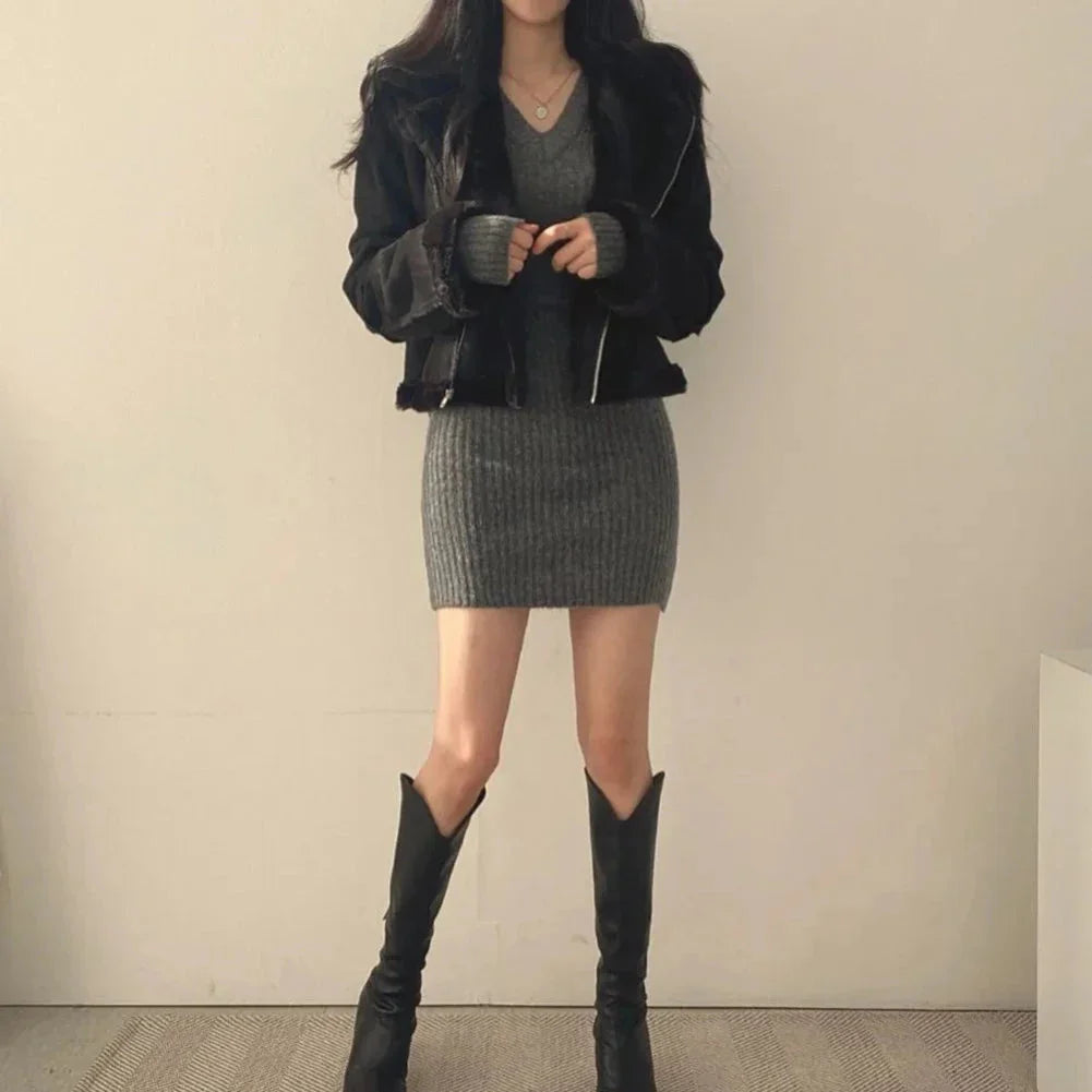 Žebrované pletené minišaty s výstřihem do V