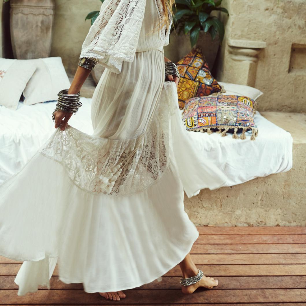 Tyto splývavé boho šaty jsou pro každou módní ženu nezbytností pro toto léto. Jsou vyrobeny z lehké a vzdušné látky, která vám zajistí pohodlí a volnost pohybu. Šaty mají dlouhý, maxi střih, který krásně splývá a zdůrazňuje jemnou ženskou siluetu. Dekorativní krajka, rozparky a volánky jim dodávají ještě větší styl.