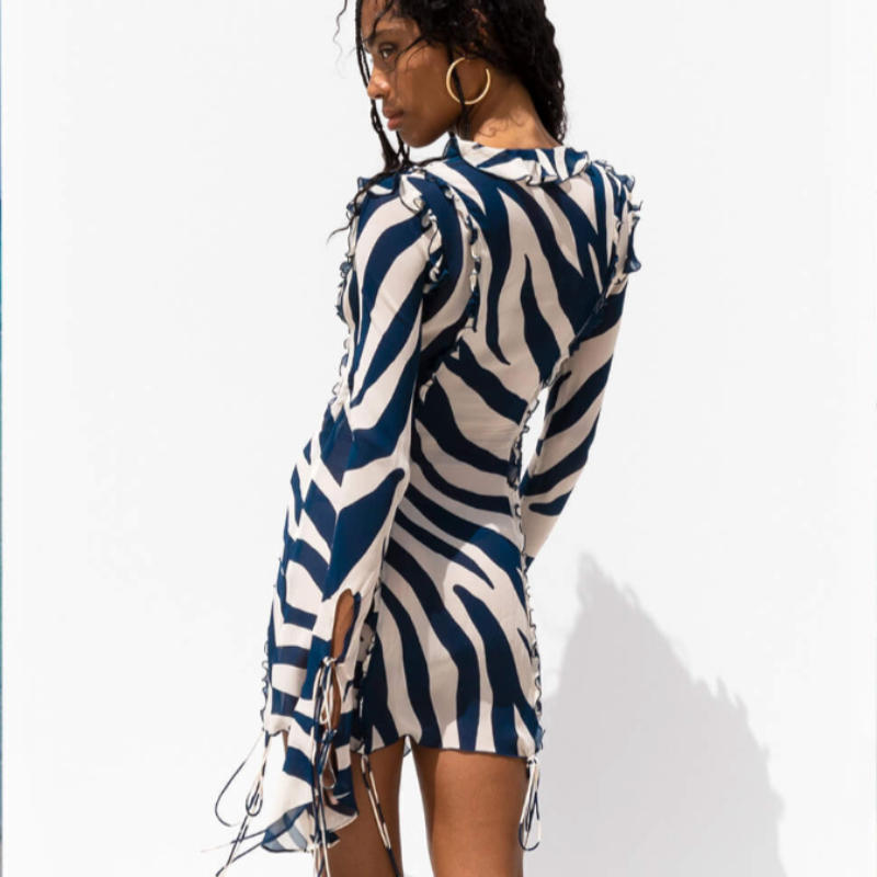 Tyto letní minišaty se perfektně hodí jako přehoz přes plavky nebo jako letní outfit na večírky či festivaly. Jejich jedinečný zebrí potisk jim dodává charakter, zatímco dlouhé rukávy poskytují ochranu před sluncem. Výstřih do V decentně zvýrazňuje ženskou postavu, zatímco ozdobné volánky a stahovací šňůrky dodávají styl. Šaty jsou vyrobeny z vysoce kvalitních materiálů, které zajišťují odolnost a pohodlí.